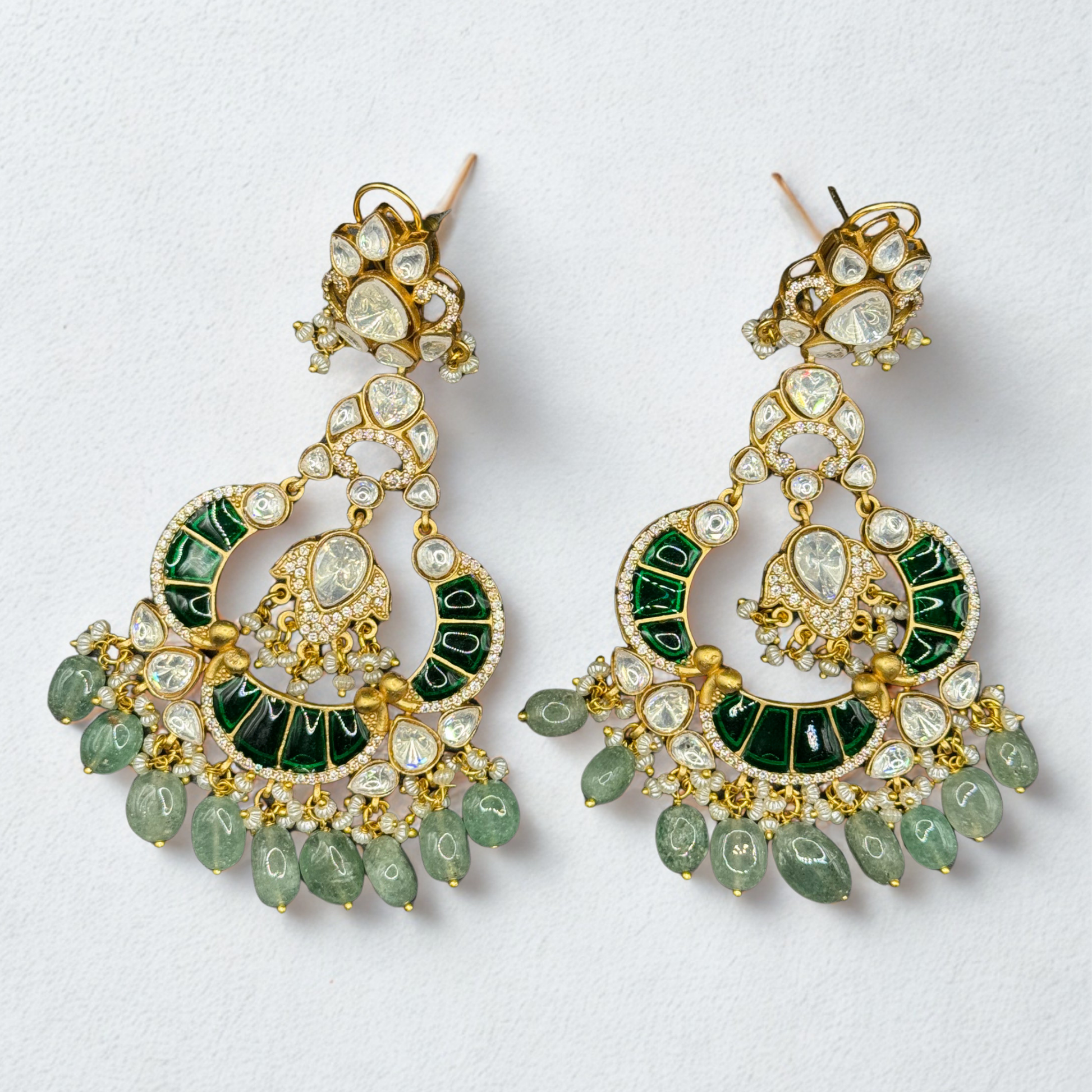 The Mehreen Chandbali is a celebration of Mughal grandeur and timeless femininity. Handcrafted in gold-toned metal, these magnificent chandbalis feature lustrous Kundan crystals framing rich emerald green meenakari enamel work. Delicate sage green aventurine drops cascade from the base, swaying gracefully with every movement. With a secure stud fastening, they are perfect for long celebrations — weddings, Eid gatherings, or any occasion that calls for something truly extraordinary. Made for the woman who wears her heritage with pride.